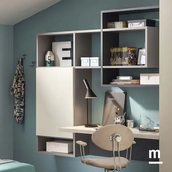 Для полноценного рабочего места необходима полка или книжный шкаф. В данном решении полка позволяет организовать рабочее пространство за счет классических открытых полок и ящиков, позволяющих хранить под рукой все необходимое.